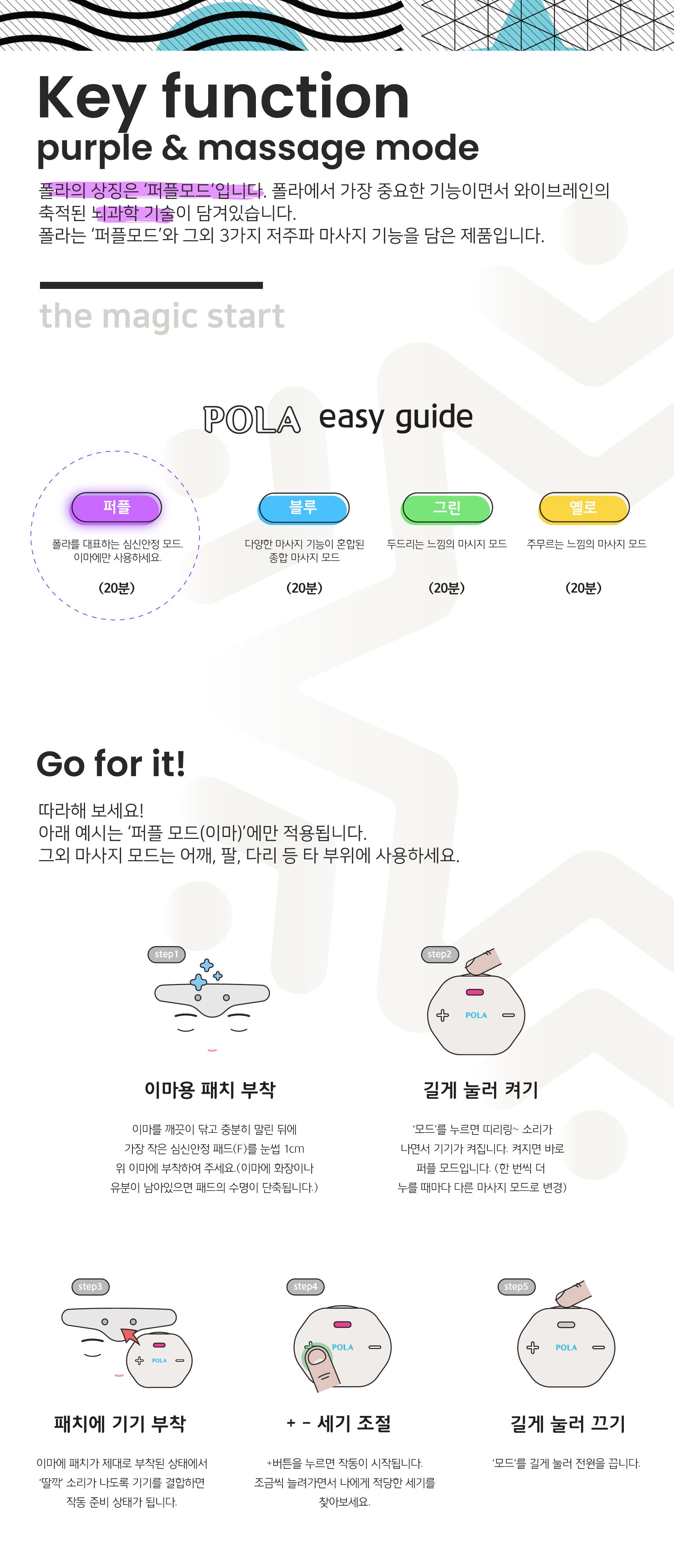 - 이마에 자극을 하실 때는 퍼플(보라색) 모드만 사용하십시오 (마사지 모드는 통증을 유발할 수 있습니다).